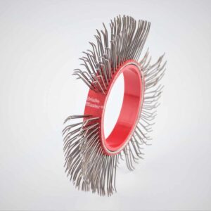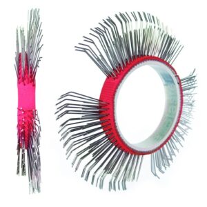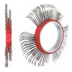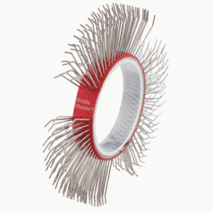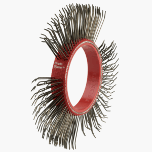 The “hardened” wire bristle tips rotate and kinetic energy is created as the tips strike the surface. The tips instantly retract with the paint particles and other corrosive debris and leaves a clean metal surface.
